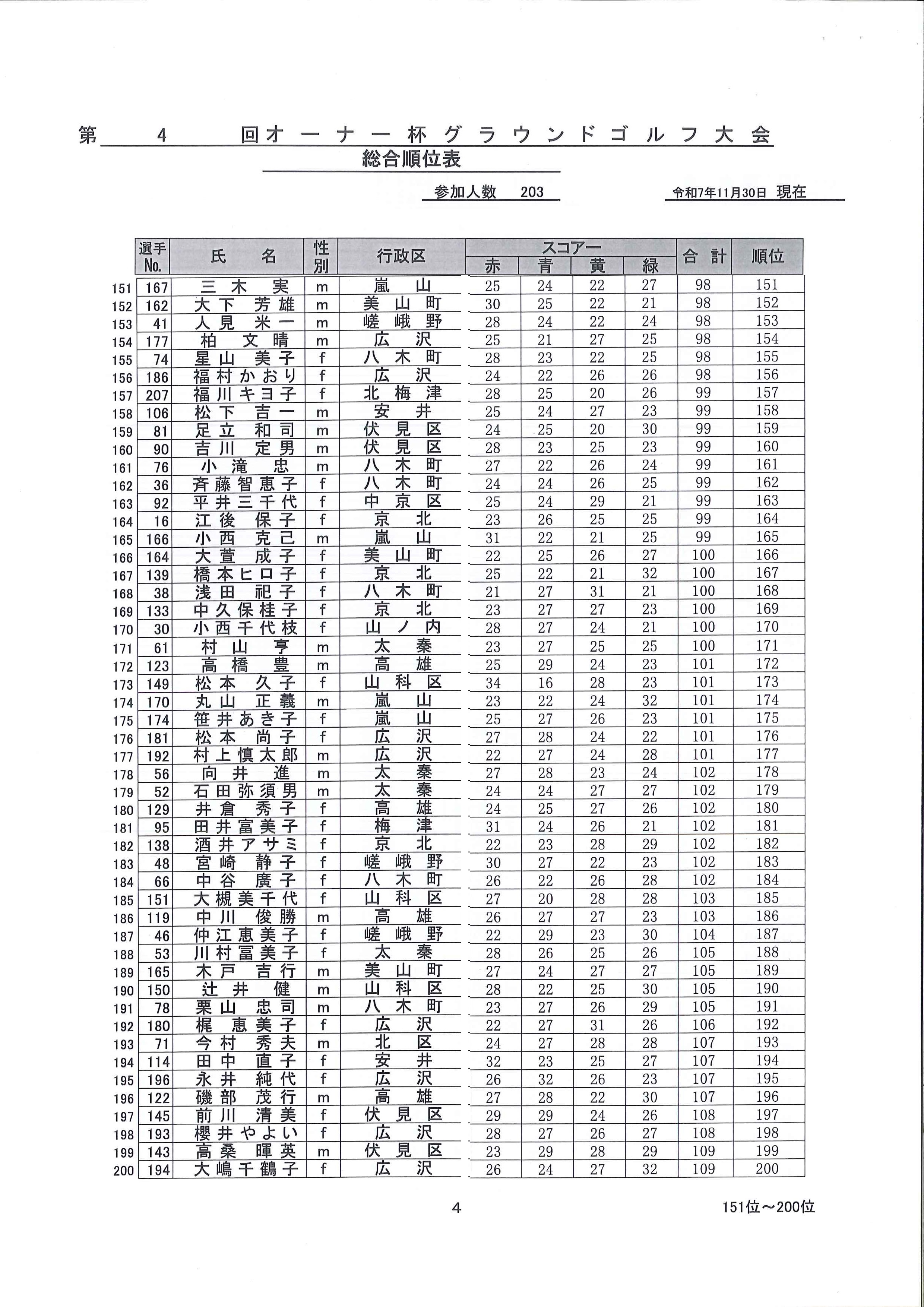 ◆◆第4回三光住宅オーナー杯 成績表--4--